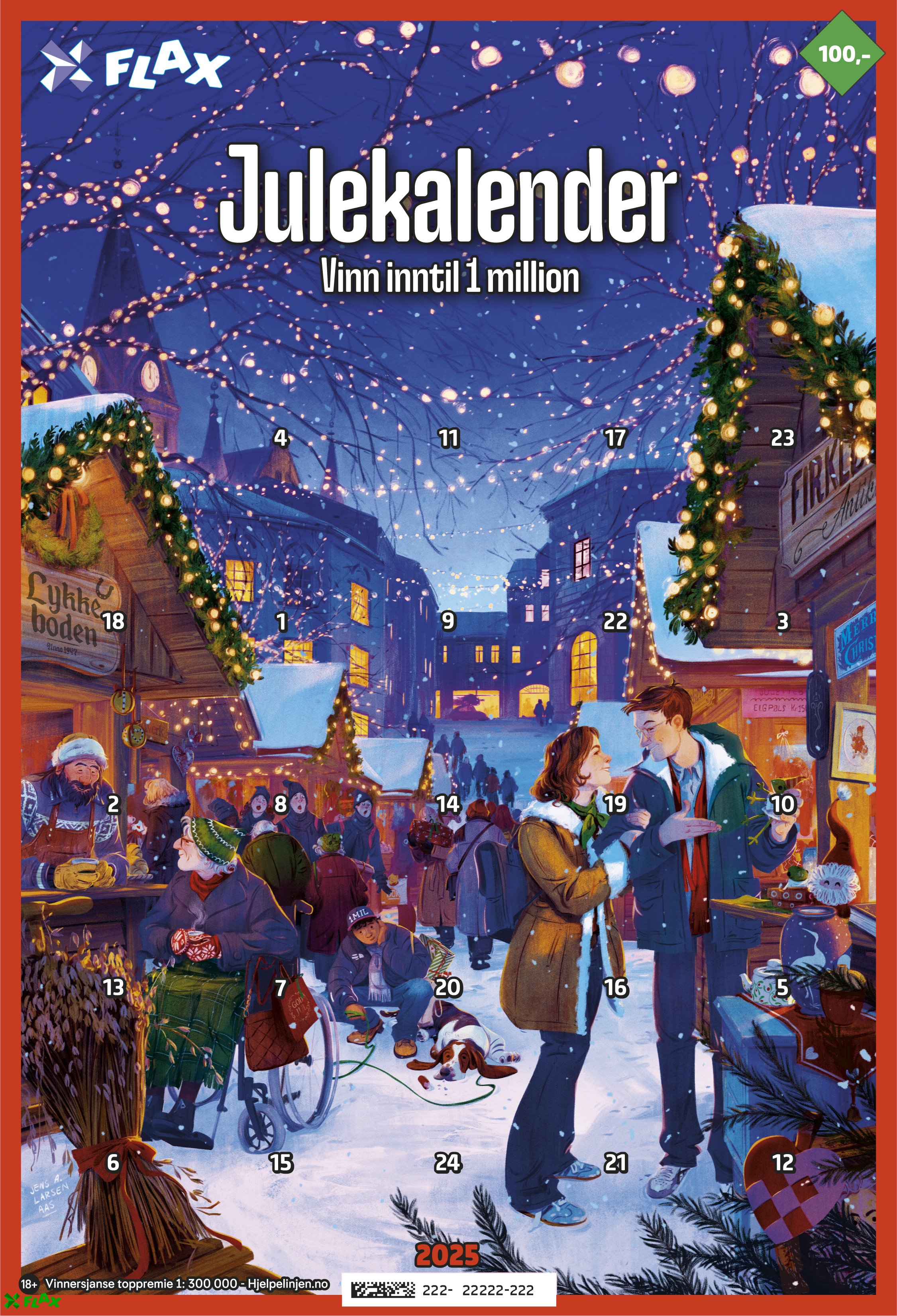 Vår mest populære julekalender med både luker og skrapefelt. Vinnersjanse hver dag! Pris 100.- Toppremie 1 000 000.- Vinnersjanse toppremie 1: 300 000 Antall lodd per pakke: 10 Pris per pakke: 1.000.-